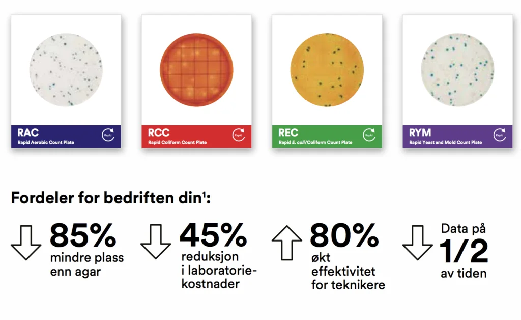Det finnes 3M Petrifilm for de fleste mikrobiologiske analyser, inkludert: